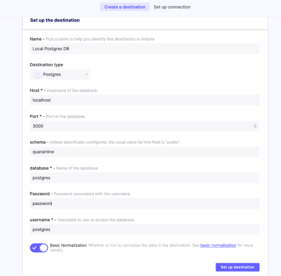 And a local Postgres Database, making sure that "Basic normalization" is enabled: